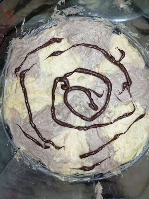 Na prvu koru slagati kremu pomoću kašike za sladoled ili obične kašike. Stavljati jednu kašiku tamne kreme, pa jednu svetle i tako dok ne popunite sve. Ako su ostale rupe između krema popunite ih lino ladom, ja sam uradila kao što vidite na fotografiji. Premažite slatkom pavlakom pa poklopiti drugom korom, sa njom ponoviti isti postupak.